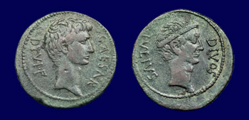 The grand-nephew of Julius Caesar, Octavian at age nineteen, was adopted as his son in Caesar's will. Two years later, Caesar was deified by the Senate. On this coin Octavian portrayed his father as a god and himself as the son of a god in order to assert his authority within the Triumvirate.Attractive green patina